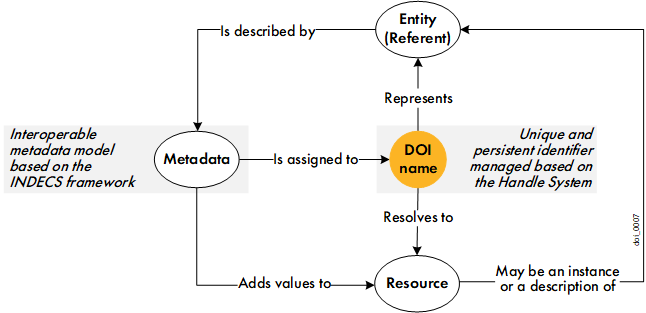 Any entity (digital, physical, or abstract) can be identified by a global unique and persistent identifier called a DOI name. The DOI name can be resolved to a resource, such as a web or internet resource, metadata describing the entity, a landing page with access to further resources, etc.
