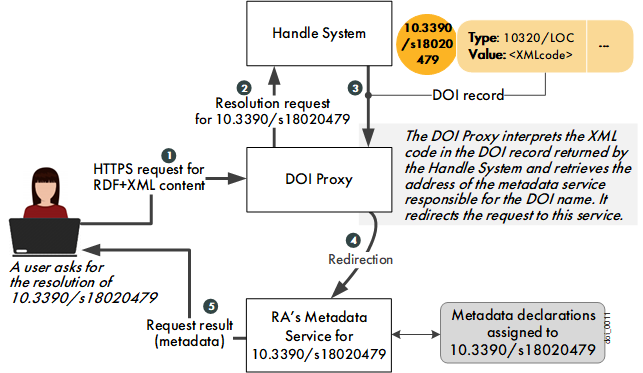 The following figure shows a redirection to the metadata service managing the DOI name. The 10320/LOC element information can be stored at prefix level (see 10320/LOC at Prefix Level): should an RA at some point need to change their approach to linked data and point to a different service or use different parameters, the change could be made to a single DOI prefix and it would apply to all of the millions of DOI names automatically.