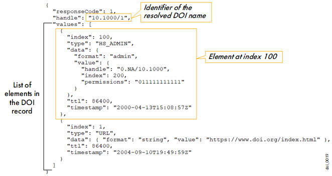 An element consists of: •an index (an integer): unique element identifier inside the Handle Record •a type (a string): for example, URL, description, IP address, email address, etc. •a value (a data object): see table below •a timestamp (an ISO8601-formatted string): date and time of the last data update •a Time To Live (TTL; an integer, or, in the rare case of an absolute expiration time, an ISO8601-formatted string): specifies how long the element value can be cached before the information source should again be consulted The table below describes the "value" property depending on the "format" property of the element data object. For more information about HS_ADMIN, HS_VLIST and HS_SITE data, see Digital Object Identifier Resolution Protocol (DO-IRP) Specification.